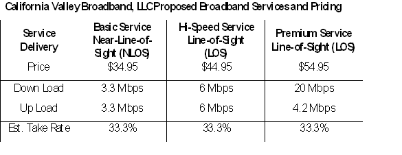 CVB proposes to offer high-speed internet access service at speeds of up to 20 mbps download and up to 6 mbps upload. The following table outlines CVB's initial product and pricing service strategy. CVB's proposal includes a 3-year term commitment which guarantees this pricing program for three (3) years. CVB's Terms of Service include a 30-day money back guarantee with any 1-year or 2-year subscription plan. Customers with a one or two year plan may cancel the agreement for any reason by delivering written notice to Provider at any time within 30 days after the effective date of the Agreement. Non-recurring charges include a basic installation fee for non-term agreement equal to $150 for a single computer. Installation of home network is optional; the fee is $125 and includes Wireless Router. Any network services will be provided for $75 per hour of technician time on site plus travel. CVB's business terms and conditions will apply to all customer accounts.