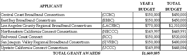 This resolution approves seven California Advanced Services Fund Rural and Urban Broadband Consortia grants. Specifically, we approve Year 1 budgets amounting to $1,669,895 for the seven consortia applicants shown below as well as a three-year budget allowance subject to conditions as specified in this resolution. The Commission awards these grants pursuant to California Public Utilities Code section 281 and Decision (D.) 11-06-038, which approved the implementation of the Rural and Urban Regional Broadband Consortia grant program and the funding of activities promoting broadband deployment, access, and adoption.