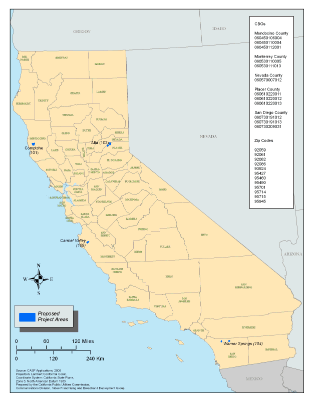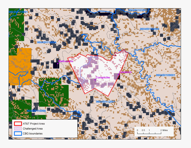 AT&T submitted a project proposal for the Comptche area of Mendocino County. AT&T plans to offer high speed, stand alone, internet access service, where technically feasible, using existing DSL technology and where it has wire line facilities. This project will be able to serve 97 households covering an area of 11.51 square miles in 2 CBGs. The 40% CASF subsidy for the project is $15,200 plus Contribution in Aid of Construction (CIAC) of $3,192 for a total CASF award of $18,392.