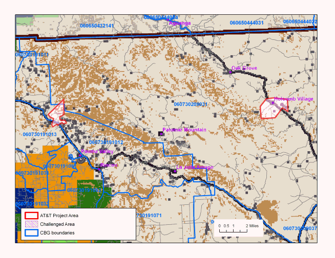 AT&T submitted a project proposal for the Warner Springs area of San Diego County. AT&T plans to offer high speed, stand alone, internet access service, where technically feasible, using existing DSL technology and where it has wire line facilities. This project will be able to serve 66 households covering an area of 3.5 square miles in 3 CBGs. The 40% CASF subsidy for this project is $77,600 plus CIAC of $16,296 for a total CASF award of $93,896.