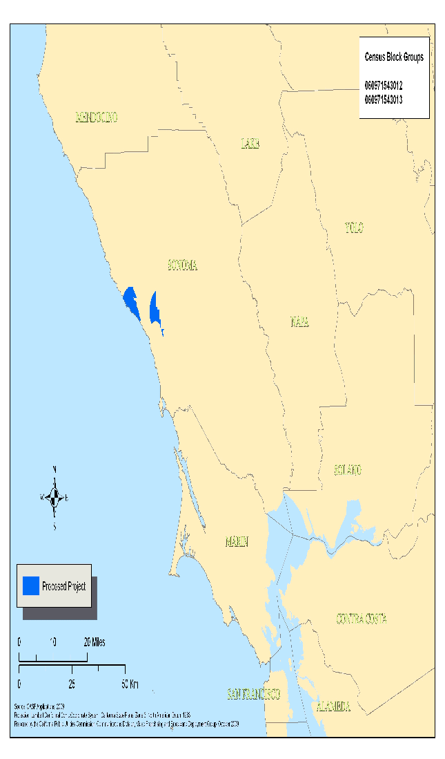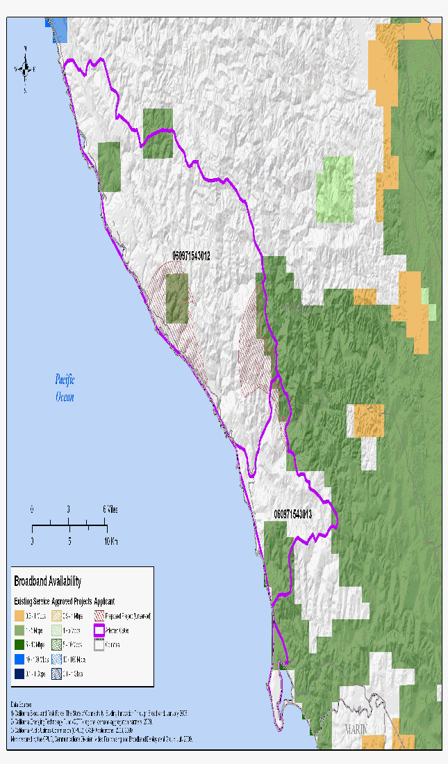 CD verified this project and, when necessary, requested additional information and/or meetings with the applicant to clarify its project proposal. Of the three CBGs in this project, two appeared to be already served per the CBTF; however, CD contacted local businesses and spoke to residents and service providers to validate the CBTF map data. In the Timber Cove area, the CBTF shows service at speeds of between 5-10 mbps but one prominent hotel serving that coastal community asserted that no one in the area has speed that fast. The hotel, in fact, pays for a T-1 dedicated line as does the local school in Fort Ross; everyone else in the community with internet service subscribes to satellite service. CD contacted a resident, to whom the hotel referred for more specific information, and the resident attested that the only broadband service available for Timber Cove is from Hughes Satellite. According to this resident, although there is service, it is extremely slow, spotty, unreliable, and expensive, costing $129 per month.