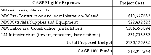 The Northeastern California project, as modified, will cost an estimated $180,129,635 of which 10%, or $18,012,964, is being requested from CASF as a match to BBA's 80% ARRA fund request. A breakdown of costs is as follows: