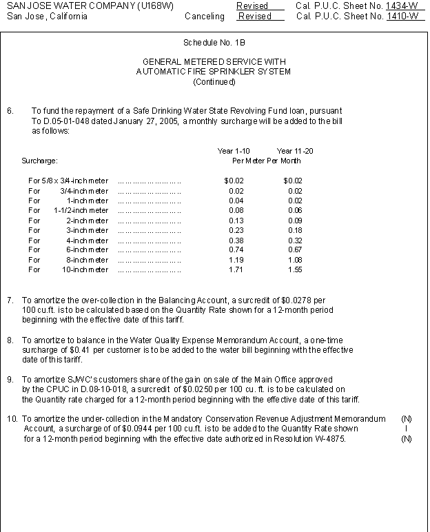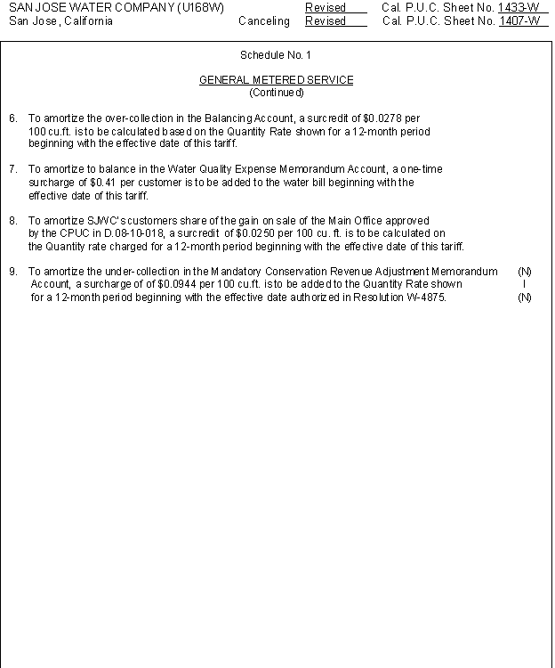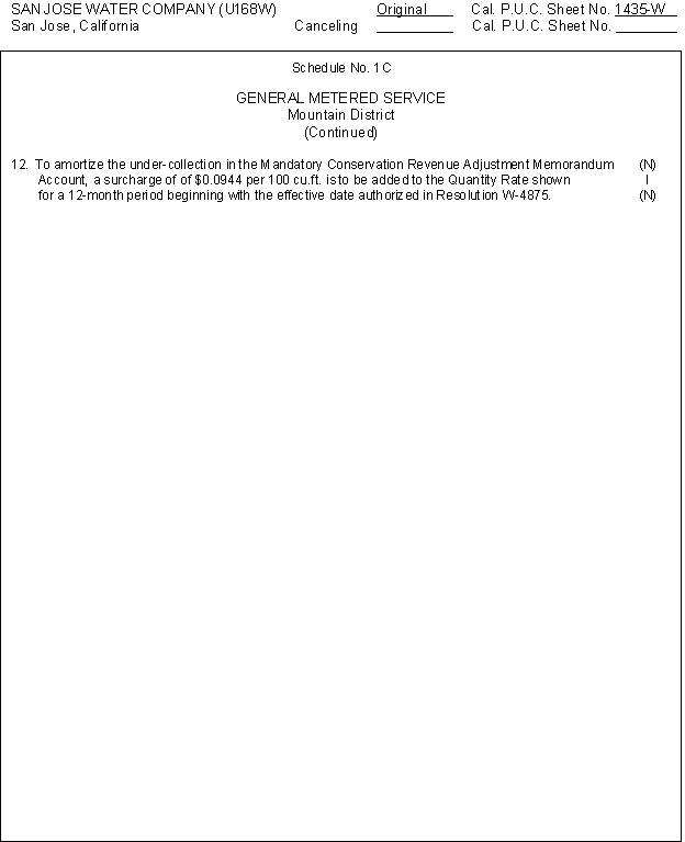1. On June 3, 2010, San Jose Water Company filed Advice Letter 415 to request amortization of its Mandatory Conservation Revenue Adjustment Memorandum Account. San Jose Water Company requested to recover in rates the amount of $6,011,377 by adding a surcharge of $0.0989 per 100 cubic feet to the Quantity Rates in each customer's bill to be recovered over twelve months.