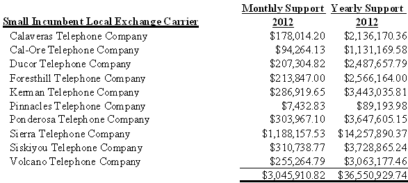 2. The total approved California High Cost Fund-A support of $36,550,929.74 for the small Incumbent Local Exchange Carriers for Current Year 2012 is listed below: