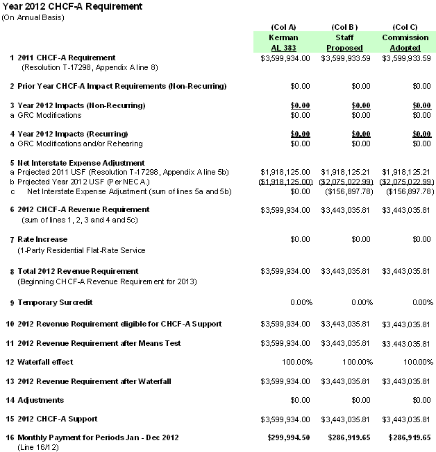 Kerman has a 2012 CHCF-A revenue requirement of $3,443,035.81 (at Line 6, Page 8 of Appendix A). Thus, Kerman shall receive monthly CHCF-A support in the amount of $286,919.65, i.e. one-twelfth of $3,443,035.81, for January through December 2012.