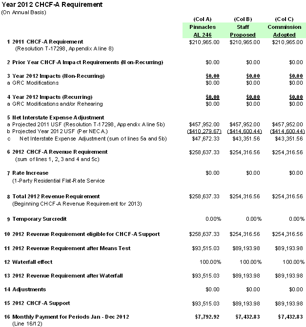 Pinnacles has a 2012 CHCF-A revenue requirement of $254,316.56 (at Line 6, Page 9 of Appendix A). After the means test, Pinnacles has a 2012 revenue requirement of $89,193.98. Thus, Pinnacles shall receive monthly CHCF-A support in the amount of $7,432.83, i.e. one-twelfth of $89,193.98, for January through December 2012.
