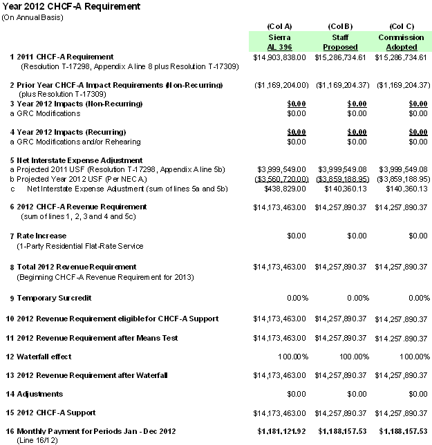 Sierra has a 2012 CHCF-A revenue requirement of $14,257,890.37 (at Line 6, Page 11 of Appendix A). Thus, Sierra shall receive monthly CHCF-A support in the amount of $1,188,157.53, i.e. one-twelfth of $14,257,890.37, for January through December 2012.