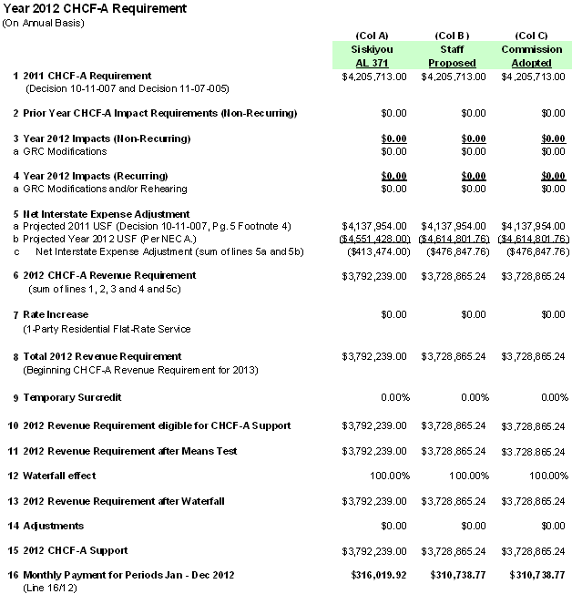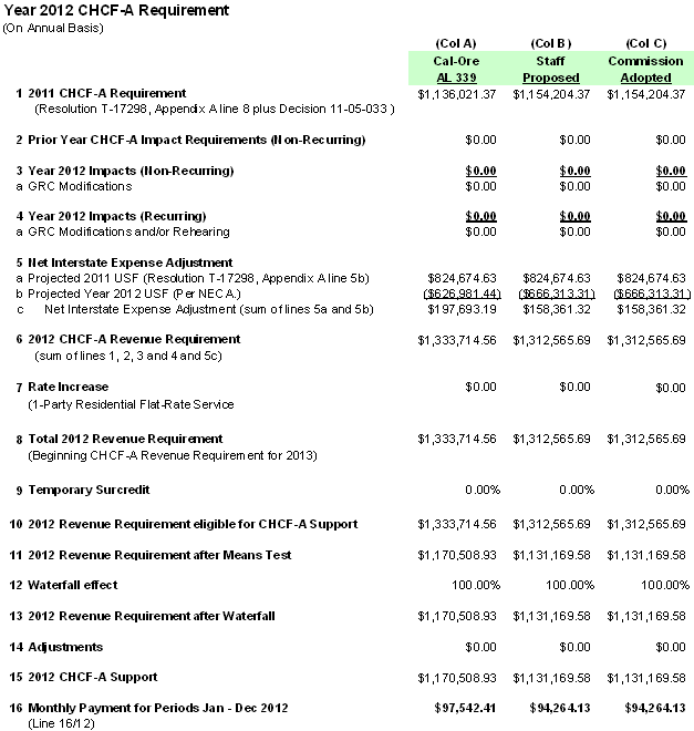 Cal-Ore has a 2012 CHCF-A revenue requirement of $1,312,565.69 (at Line 6, Page 2 of Appendix A). After the means test, Cal-Ore has a revenue requirement of $1,131,169.58 (at Line 11, Page 2 of Appendix A). Thus, Cal-Ore shall receive monthly CHCF-A support in the amount of $94,264.13, i.e. one-twelfth of $1,131,169.58, for January through December 2012.