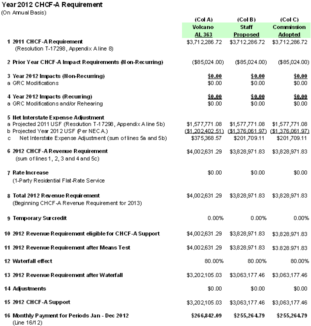 Volcano has a 2012 CHCF-A revenue requirement of $3,828,971.83 (at Line 6, Page 13 of Appendix A). Volcano will not file for a GRC in 2011 and their waterfall will drop to 80% for CY 2012. Thus, Volcano shall receive monthly CHCF-A support in the amount of $255,264.79, i.e. one-twelfth of $3,063,177.46, for January through December 2012.