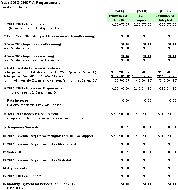 Winterhaven has a 2012 CHCF-A revenue requirement of $210,314.25 (at Line 6, Page 14 of Appendix A). In its advice letter, Winterhaven stated that they are not requesting a draw from the CHCF-A. Thus, Winterhaven will not receive any CHCF-A support for 2012.