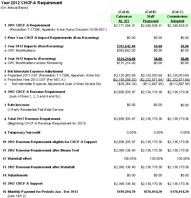 Calaveras has a 2012 CHCF-A revenue requirement of $2,136,170.36 (at Line 6, Page 1 of Appendix A). Thus, Calaveras shall receive monthly CHCF-A support in the amount of $178,014.20, i.e. one-twelfth of $2,136,170.36 for January through December 2012.