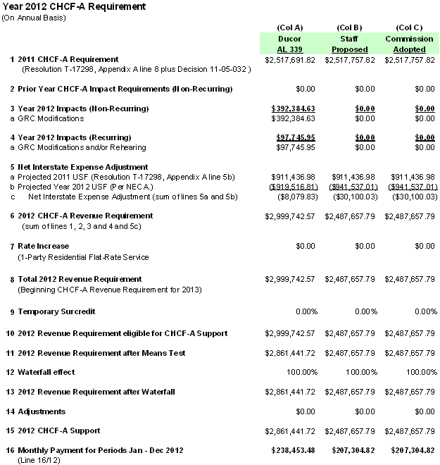 Ducor has a 2012 CHCF-A revenue requirement of $2,487,657.79 (at Line 6, Page 3 of Appendix A). Thus, Ducor shall receive monthly CHCF-A support in the amount of $207,304.82, i.e. one-twelfth of $2,487,657.79 for January through December 2012.