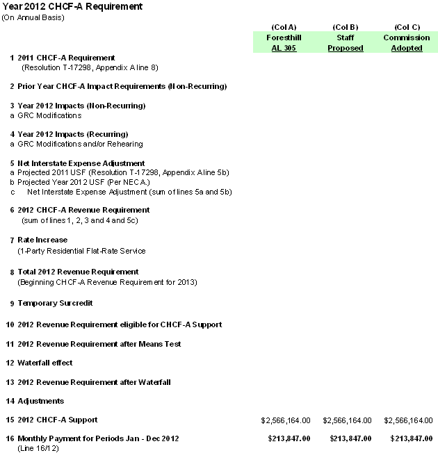 In a pending Commission Decision, Appendix A shows the expected CHCF-A support of $2,566,164. Thus, Foresthill shall receive monthly CHCF-A support in the amount of $213,847, i.e. one-twelfth of $2,566,164, for January through December 2012.