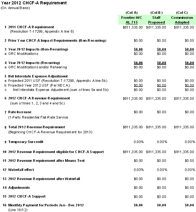 Frontier-WC has a 2012 CHCF-A revenue requirement of $811,335 (at Line 6, Page 5 of Appendix A). In its advice letter, Frontier-WC stated that they are not requesting a draw from the CHCF-A. Thus, Frontier-WC will not receive any CHCF-A support for 2012.