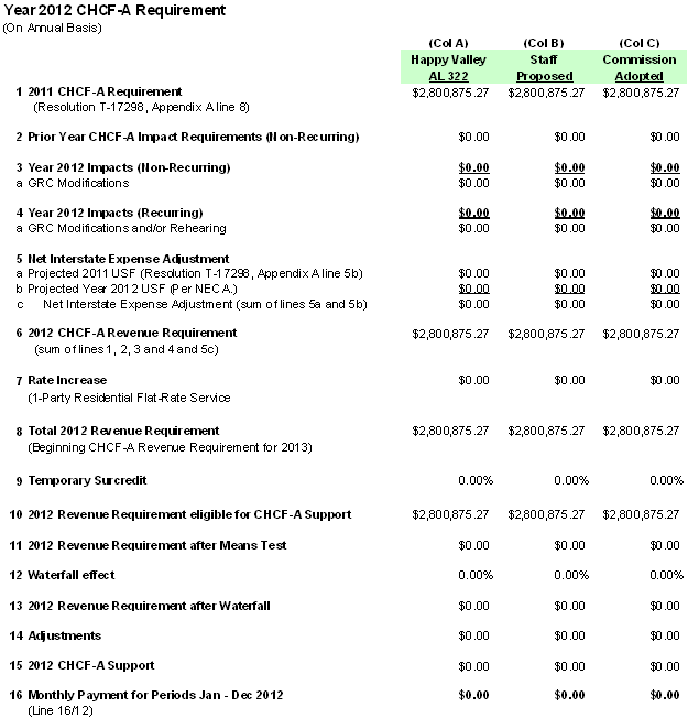 Happy Valley has a 2012 CHCF-A revenue requirement of $2,800,875.27 (at Line 6, Page 6 of Appendix A). In its advice letter, Happy Valley stated that they are not requesting a draw from the CHCF-A. Thus, Happy Valley will not receive any CHCF-A support for 2012.