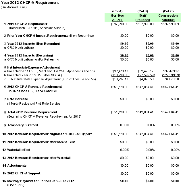 Hornitos, has a 2012 CHCF-A revenue requirement of $542,864.41 (at Line 6, Page 7 of Appendix A). In its advice letter, Hornitos stated that they are not requesting a draw from the CHCF-A. Thus, Hornitos will not receive any CHCF-A support for 2012.