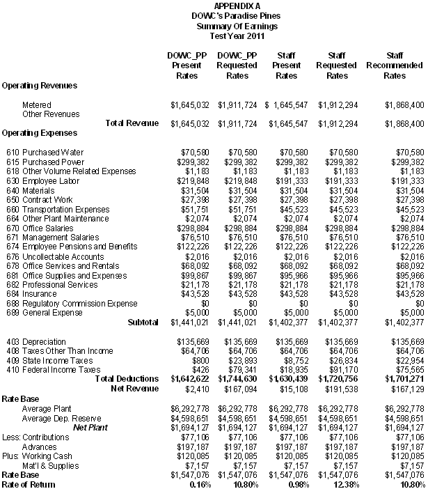 The Division made an independent analysis of DOWC's operations. Appendix A provides DOWC's and the Division's estimated summary of earnings at present and proposed rates for TY 2011 and the Division's recommended rates for TY 2011. DOWC