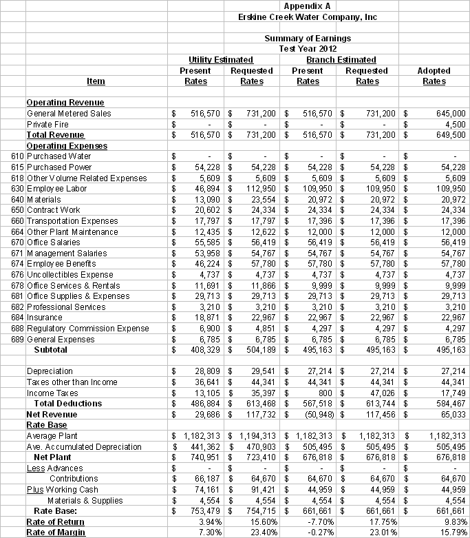 The Division made an independent analysis of ECWC's operations. Appendix A shows ECWC's and the Division's estimated summary of earnings at present, proposed, and recommended rates for TY 2012, to be phased in during years 2012 and 2013. Appendix B includes the Division's tariff rates for TY 2012, and Escalation Year 2013. The Division informed ECWC of how the methodologies it used differed from those used in ECWC's request. ECWC is now in agreement with the Division's recommended revenue requirement, shown in Appendix A, and the Division's recommended rates, shown in Appendix B. The Division recommends that the Commission approve the rate increases and resulting rates shown in Appendix B.