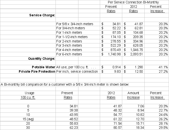 19. At the recommended rates shown in Appendix B, bi-monthly rates for an average consumption of 15 Ccf (one Ccf is equal to one hundred cubic feet) will increase from $48.52 to $61.22, a difference of $12.70 or 26.20% in TY 2012; and $61.22 to $66.12, a difference of $4.90 or 8.00% in Escalation Year 2013.