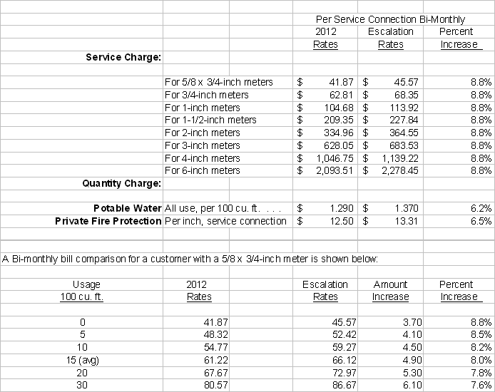 ECWC's rate structure consists of two schedules: 1, General Metered Service and 4, Private Fire Protection Service. The rates proposed by the Division are shown in Appendix B. At the Division's recommended rates, the increase in revenues will be $132,930 or 25.70% for TY 2012 and $50,000 or 7.70% for Escalation Year 2013. At the recommended rates shown in Appendix B, bi-monthly rates for an average consumption of 15 Ccf (one Ccf is equal to one hundred cubic feet) will increase from $48.52 to $61.22, a difference of $12.70 or 26.20% in TY 2012; and $61.22 to $66.12, a difference of $4.90 or 8.00% in Escalation Year 2013. A comparison of customer bills at present, recommended, and escalation rates is shown in Appendix C. The projections, adopted quantities, and tax calculations are shown in Appendix D. The Division recommends that the Commission require ECWC to file a Tier 2 advice letter on or before November 20, 2012, to reflect escalation rates for 2013 and that the revised tariffs reflecting these escalation rates be made effective on January 1, 2013.