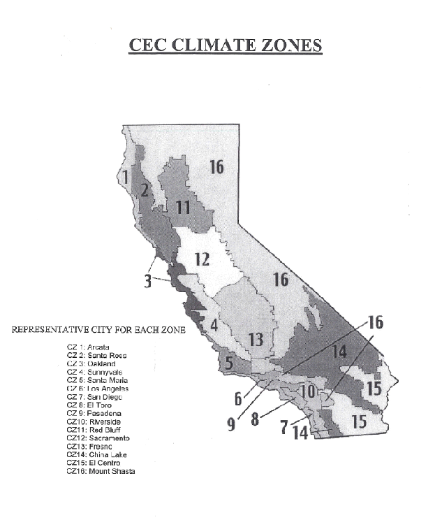 cost-effective (that is, passes both the participant and utility tests) only in Climate Zone 14 in the PG&E and SDG&E area for single family and mobile home residences and in Climate Zone 15 in the SDG&E area for all housing types. It also passes the Participant Test and barely falls short of passing the Utility Test for multifamily residences in Climate Zone 14 in the SDG&E area. The measure also passes the Modified Participant Test in Climate Zone 15 for all housing types in the SCE area, although it does not pass the Utility Test. The following map defines the climate zones as developed by the California Energy Commission (CEC):