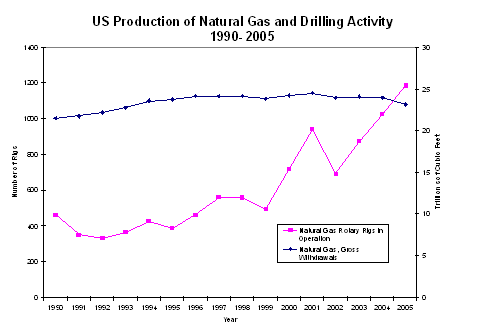 During the 1990s, these technologies had an immense impact on the price of natural gas. Technology development combined with the excess deliverable capacity that existed during those years helped keep prices low. In fact, natural gas prices stayed in the range of $2.50 to $3.50 per thousand cubic feet ($/mcfd) for over a decade. Since 2000, that trend has changed. The excess productive capacity no longer exists and producers have not been able to increase production levels despite drilling record numbers of wells. Consequently, natural gas prices have reacted quickly and have stayed high for the past 5 years.