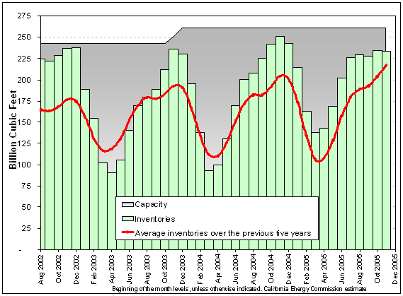 California experienced very low storage levels during the winter of 2001 when pipeline constraints and cold weather strained supply capacity to consumers in the state, resulting in increased withdrawal from storage. Since then, with the expansion of storage facilities and addition of pipeline capacity, storage capacity has been adequate. Figure I.A-5 shows California's natural gas storage capacity and inventory over the past five years.