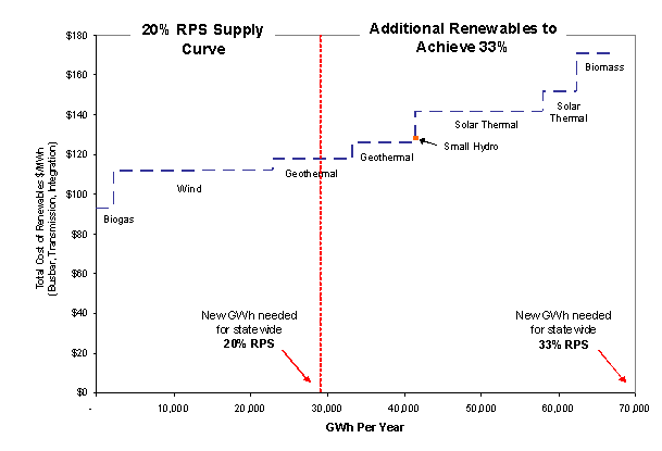 Figure 3, below, illustrates E3's analysis of the estimated total costs per MWh of the resources needed to meet statewide 20% by 2010 and 33% by 2020 goals under the scenario described on page 8 of this report. As the chart illustrates, expanding our reliance on renewable energy will likely require the procurement of resources with increasing total costs.