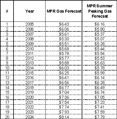 The baseload MPRs reflect an in-service capital cost of $720/kW, while the peaking MPRs reflect an in-service capital cost of $556/kW. The natural gas forecasts used in the two models are the same, except for the fact that that peaking gas forecast, per D.04-06-0155 is set at 95.8% of annual baseload gas prices to reflect an average reduction in mid-summer gas prices, when peakers typically operate. The MPRs shown in Table 1 were calculated using a gas price forecast with years 1-5 consisting of NYMEX data and four Henry Hub fundamental forecasts for years 6 -20.