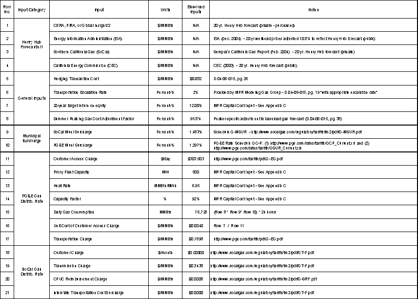 D.04-06-015 determined that NYMEX HHub futures price would be used for all or part of the first six years of the gas forecast7. For years 7-20, a fundamentals forecast approach would be used, incorporating the forecast escalation methodology advocated by certain parties8. This method entails calculating the average annual escalation rate among a number of different long-term Henry Hub forecasts, including timely forecasts produced by CERA, PIRA, Global Insight, EIA, and the CEC. This average annual escalation rate would then be used to escalate the last year of NYMEX data out to 2024. In addition, a gas hedging transaction cost would be added to both the NYMEX and fundamental gas prices9. Using this adopted methodology, parties worked collaboratively to develop the MPR gas model used to calculate the MPRs presented in this staff report10.