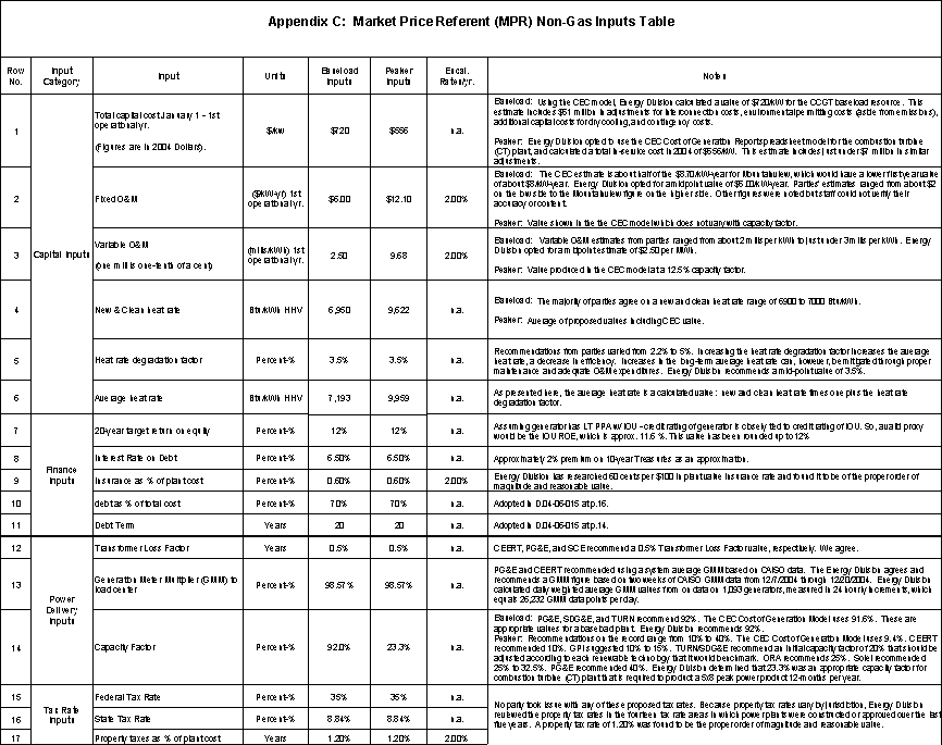 As noted earlier, the MPR model will utilize the same finance inputs, tax inputs, and power delivery inputs (aside from capacity factor) to calculate baseload and peaker MPRs. Those figures are shown in "Appendix C, Market Price Referent (MPR) Non-Gas Inputs Table" to this report.