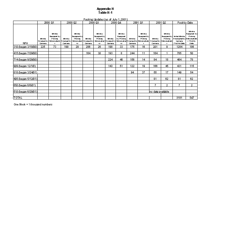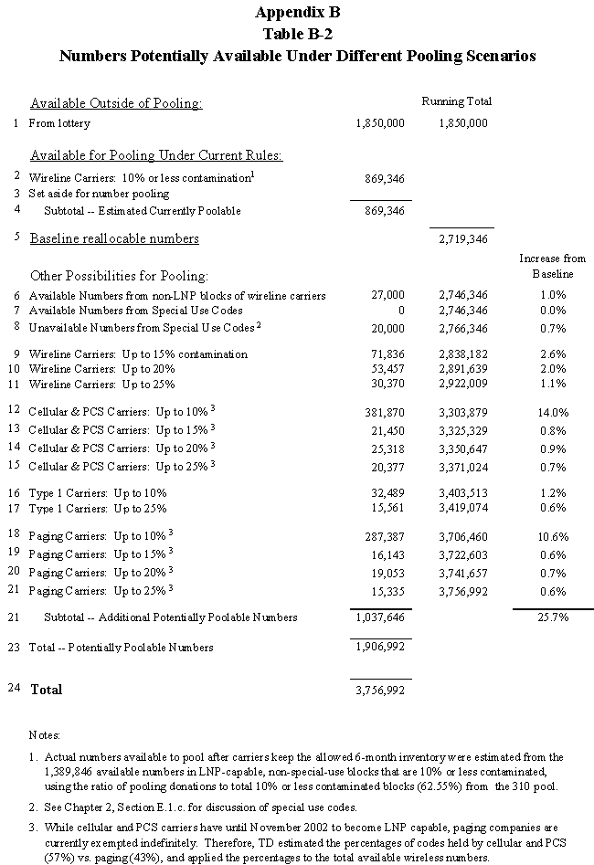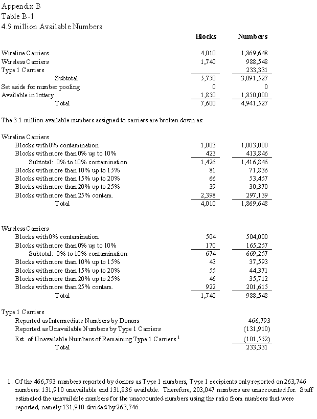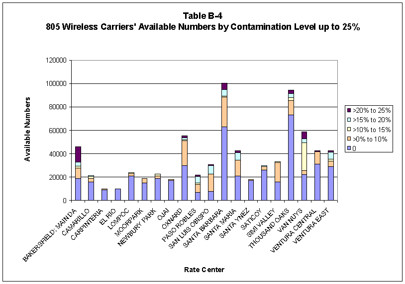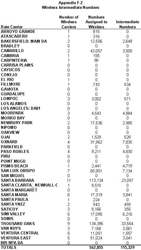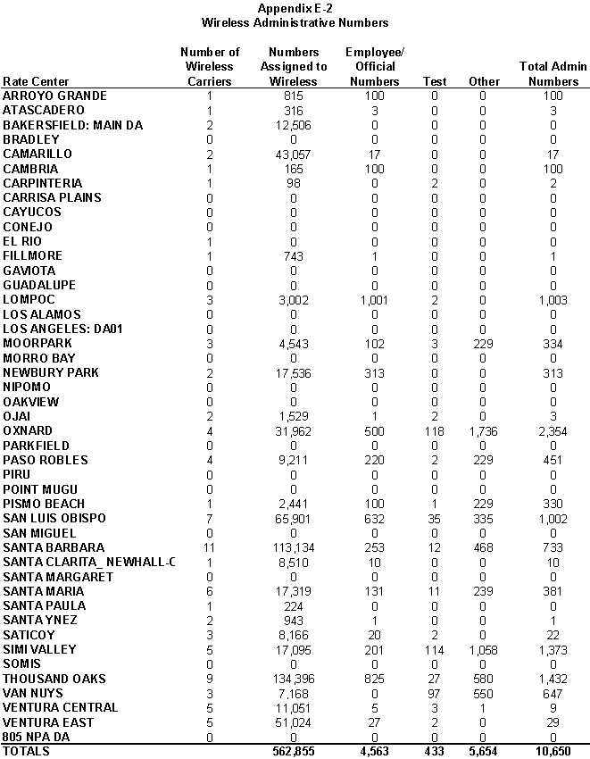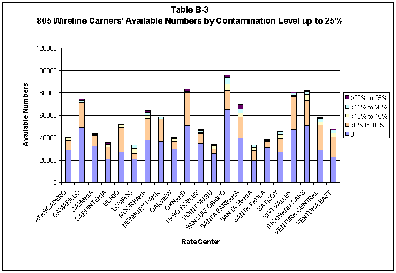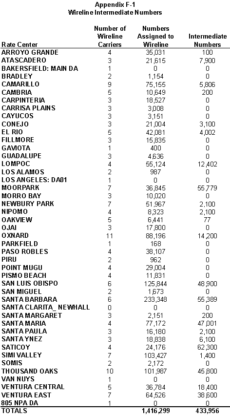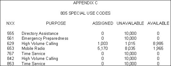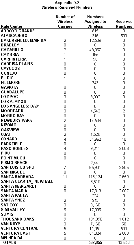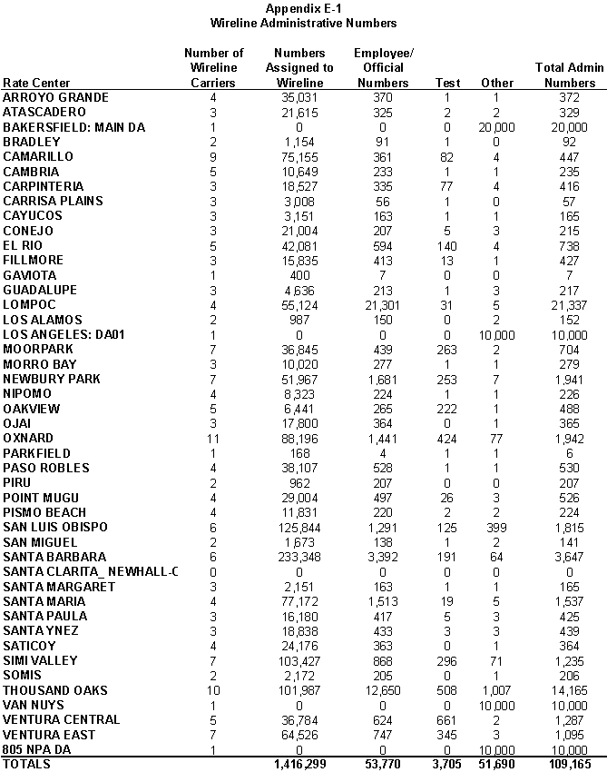 1 NANPA is a role performed by NeuStar, Inc. The FCC chose NeuStar, formerly Lockheed Martin, to perform the functions of numbering administration and area code changes nationwide. 2 Including Type 1 Carriers. Type 1 numbers are described in Chapter 2, Sec. D. 4.a. 3 At present, only wireline carriers are required to participate in number pooling. The FCC has granted most wireless carriers an extension of time, until November, 2002, to implement the technology that will support number pooling. The FCC has permanently exempted paging companies from implementing the technology necessary to pool. 4 The percentage of numbers in use in a particular block of 1,000 numbers is referred to as the "contamination" level. 5 This assumes that companies' six-month inventory needs would be satisfied out of the unused numbers in the blocks greater than 25% contaminated. 6 Today called the Incumbent Local Exchange Carrier (ILEC) 7 Today called Competitive Local Exchange Carriers (CLEC) 8 In addition, the California state legislature enacted Section 7937 of the California Public Utilities Code. Effective on January 1, 2000, Section 7937 requires the CPUC to prepare and submit to the Legislature, by July 1, 2001, a study of the telecommunications industry's usage rates of telephone numbers in all California area codes. This report also complies with that legislative requirement with respect to the 805 area code. 9 A company's request for its first prefix in the rate center is considered an initial request; requests for additional prefixes are considered growth requests. 10 TD's analysis of available numbers in the remainder of this report uses 185 prefixes available for lottery as of the utilization data date of August 31, 2000. 11 See Chapter Three of this report for a discussion of LNP. 12 FCC's Opinion and Order on Telephone Number Portability FCC 97-74, issued March 6, 1997 13 Cellular companies, PCS companies, and paging companies comprise the wireless category. 14 ILECs and CLECs 15 The following area codes have pooling trials: 310, 408, 415, 510, 650, 714, 818, 909. 16 The CPUC revised the imminent exhaust criterion from three months to six months in Joint Assigned Commissioner and Administrative Law Judge's Ruling Implementing Revised Procedures to Conform to FCC Order, dated April 30, 2001. 17 Report and Order and Further Notice of Proposed Rulemaking, CC Docket No. 99-200 FCC 00-104 (released March 31, 2000). 18 Wireline carriers are composed of ILECs and CLECs. 19 A detailed break-down of the available 3.09 million numbers is shown in Table B-1 in Appendix B. 20 2.72 million numbers is comprised of 869,000 estimated pooling donations by companies, plus 1.85 million available through the lottery. 21 The recommendations include receiving authority from the FCC to increase contamination threshold rates (25%) for pooling, recovering blocks from special use codes, and recovering unused numbers from non-LNP capable carriers and Type 1 carriers as described later in this report. 22 See Table B-2 in the appendix for a detailed breakdown of the 3.76 million numbers. 23 10% or less contaminated means that out of 1000 numbers in a block, 100 numbers or fewer have been classified as unavailable. 24 Future need may include serving new customers or offering new services. 25 See Table B-1 in Appendix B. The 452,802 is comprised of 71,836 which are in blocks that are 10-15% contaminated, 53,457 from 15-20% contaminated, 30,370 from 20-25% contaminated, and 297,139 numbers which are in blocks that are more than 25% contaminated. Later in this chapter, TD recommends additional steps that can be implemented to make more of the 452,802 numbers available for number pooling. 26 INC's Thousand Block (NXX-X) Pooling Administration Guidelines, dated January 10, 2000, state that carriers should donate specified thousand blocks. 27 Additional numbers from the last three columns of Table 2-5: 71,836+53,457+30,370=155,663 28 See Table B-2, Appendix B, for the derivation of this estimate. 29 Only rate centers where carriers hold codes are displayed on this table. 30 See Chapter 1 for the discussion on Decision 00-07-052. 31 Remote Call Forwarding allows a customer to have a local telephone number in a distant location. RFC is similar to call forwarding on a residential line, except that the RCF customer has no phone, no office and no physical presence in that location. Direct Inward Dialing uses a trunk from the central office which passes the last two to four digits of the Listed Directory Number into the PBX, thus allowing the PBX to switch the call to the correct extension without the use of an attendant. Existing DID retail service is limited to PBX services. For purposes of providing INP, DID switch functionality is used to provide INP to any CLC customer regardless of the type of terminal equipment used on the customer's premises. 32 However, two wireline carriers remain non-LNP capable. 33 The emergency preparedness prefixes are for services other than 911. 34 The number used for inter-area code directory assistance, which is uniform throughout California, is 1-XXX- 555-1212. This number has been designated for this use at the federal level. 35 An example would be a customer request for 2,500 numbers to be used in 2000, coupled with a request to have the next 2,500 numbers in sequence "reserved" for the customer to use in 2001. 36 Central Office Code (NXX) Assignment Guidelines, prepared by the Industry Numbering Committee, January 27, 1999 version, Section 4.4. 37 FCC Order 00-280, CC Docket No. 99-200, adopted and released on July 31, 2000. 38 See FCC Order 00-129, Paragraph 114 39 See Appendix D for a breakdown of reserved numbers reported in the 805 NPA by rate center. 40 In the first NRO Order, both 360 days and 365 days were used as the time period for aging business numbers. In a clarifying order, the FCC adopted 365 days as the aging period for business numbers. When the CPUC sent out the parameters for utiliz