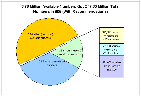 Of the 7.60 million numbers in the 805 area code, companies hold 5.75 million. The other 1.85 million numbers have yet to be assigned to companies. The CPUC's utilization study found that of the 5.75 million numbers held by companies, 3.09 million remain unused in their inventories. Therefore, 4.94 million numbers in the 805 area code remain unused. A portion of these unused numbers can be made available for use by all companies, either through pooling in the future or through the monthly lottery allocation process. In addition, companies have reported 2.66 million numbers as unavailable. A portion of these unavailable numbers can be used more efficiently if the recommendations contained in this report are implemented.