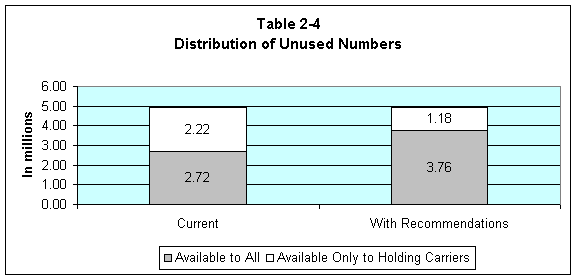 TD's analysis shows that of the 4.94 million available numbers, 1.85 million are available for companies seeking numbers via a lottery process. Companies possess the remaining unused 3.09 million numbers. Wireline carriers, such as Pacific Bell and many competitive local exchange carriers, hold roughly 1.87 million available numbers, while wireless carriers2 hold approximately 1.22 million available numbers.