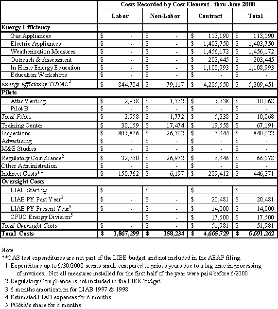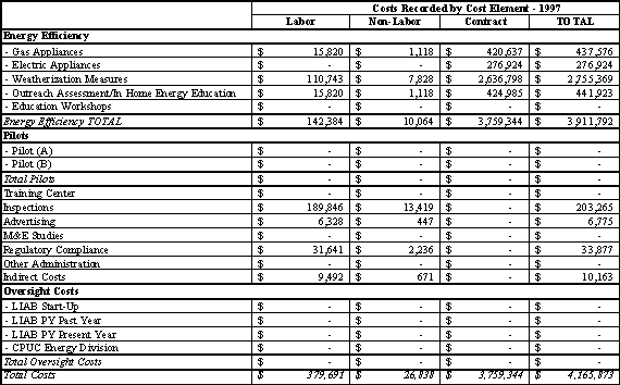Costs for the LIEE programs are separated out in several ways in Table TA 7.2. Each of the 16 cost variables along the left side of the table are divided into columns for labor, non-labor, and contract costs. These are then summed into a fourth column, total cost, for each variable.