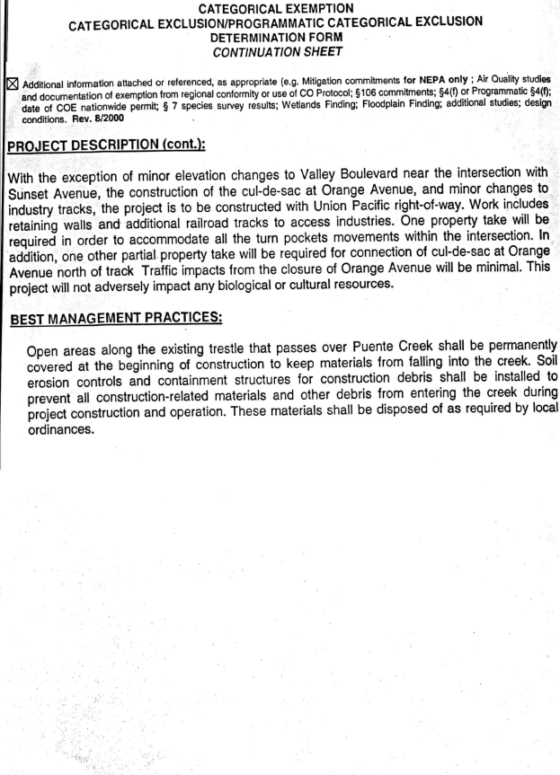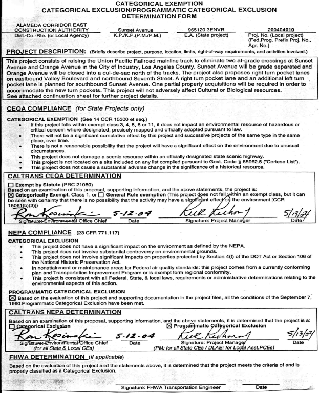 6. Caltrans prepared a Categorical Exemption and Categorical Exclusion document for this project. On May 12, 2004, Caltrans determined that the project is categorically exempt under CEQA (CEQA Guideline Section 15301, which lists projects with a Class 1 categorical exemption). On May 12, 2004, Caltrans also determined that this project was exempt under the NEPA guidelines.