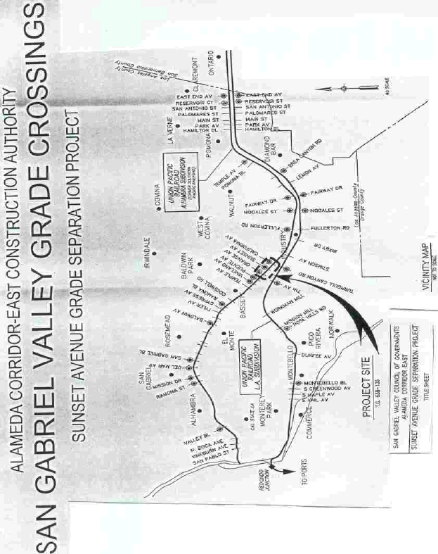 The construction of the Sunset Avenue grade separation and the permanent closure and physical removal of the Orange Avenue crossing are among many ACE projects that will reduce or eliminate train traffic - motor vehicle traffic conflicts in the San Gabriel Valley area of Los Angeles County. ACE's program includes projects at 54 public crossings and the elimination of 20 crossings through construction of grade separations (including the Sunset Avenue grade separation) and roadway closures (including the Orange Avenue crossing).