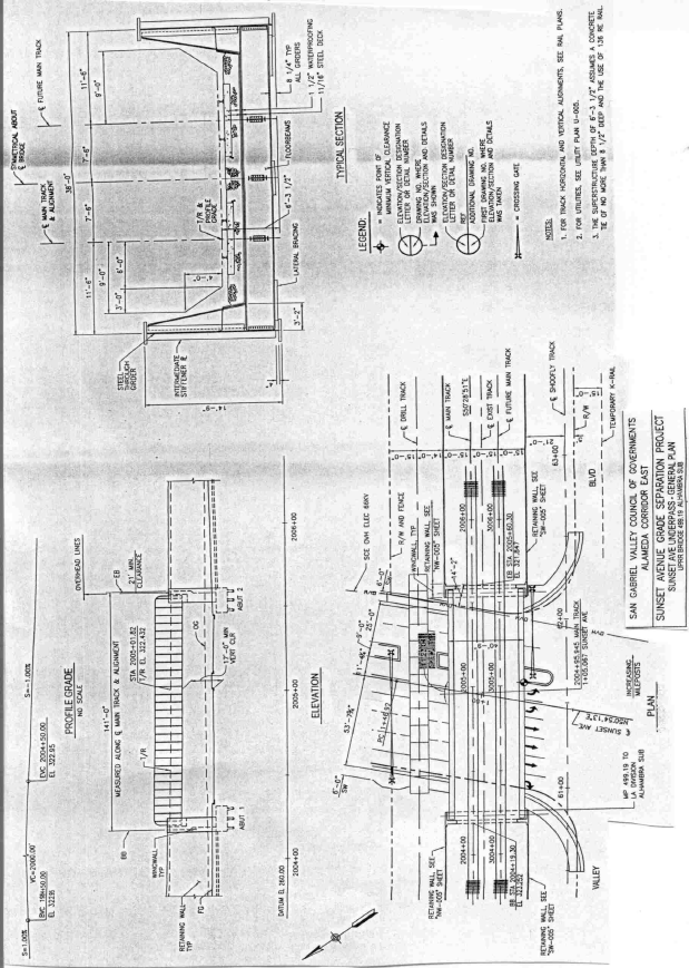 The proposed Sunset Avenue grade separation will consist of a bridge structure adjacent to railroad embankments with lengths of 4,900 feet and 2,000 feet, northwest and southeast, respectively, of the grade separation. The railroad embankments leading to the bridge structure will have retaining walls. The railroad embankments and the bridge structure will provide width for walkways as required under Commission General Order (GO) 118. To protect railroad personnel from falls on walkways, the retaining walls and the bridge structure will have guard rails. ACE designed the railroad embankments and bridge structure to provide adequate cross-sectional width for UP's future construction of a second main line track.