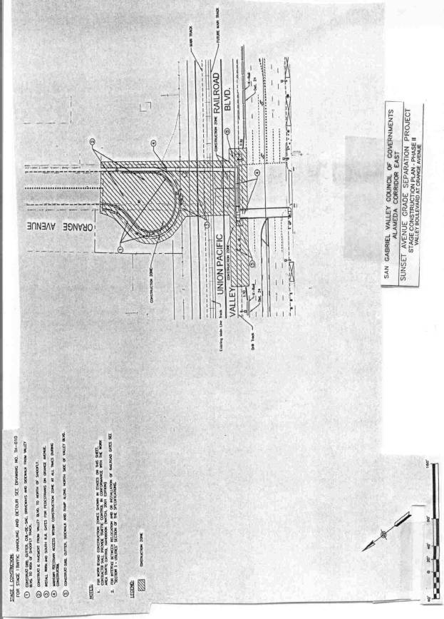 Upon the completion of the California Avenue crossing alteration, ACE, UP, and the City will reopen California Avenue to vehicular traffic and pedestrians, close Sunset Avenue temporarily to physically remove the Sunset Avenue crossing and to construct the grade separation and spur crossing, and to permanently close and physically remove the Orange Avenue crossing. During a later phase of the project, ACE and the City will build a cul-de-sac at the end of Orange Avenue, north of the tracks, to facilitate U-turns. The Orange Avenue cul-de-sac will have a barrier and fencing to minimize encroachment and trespassing onto the railroad right-of-way. ACE, UP, and the City will establish a temporary construction easement and work area traffic control along Valley Boulevard to allow construction of the proposed drill track and the proposed detour track.