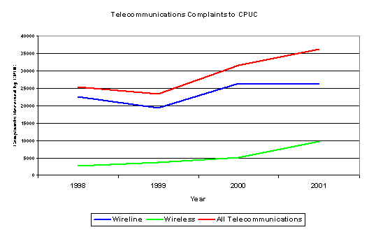 In 1998, the Commission noted an increase in consumer complaints regarding telecommunications , including many relating to service quality. As can be seen in the chart below, the trend of increased complaints is continuing. During 2001, the Commission received over 35,000 complaints about telecommunications carriers. This represents an increase of 42% over the number of complaints received by the Commission during 1998, suggesting an increasing level of consumer dissatisfaction regarding telecommunications service.33