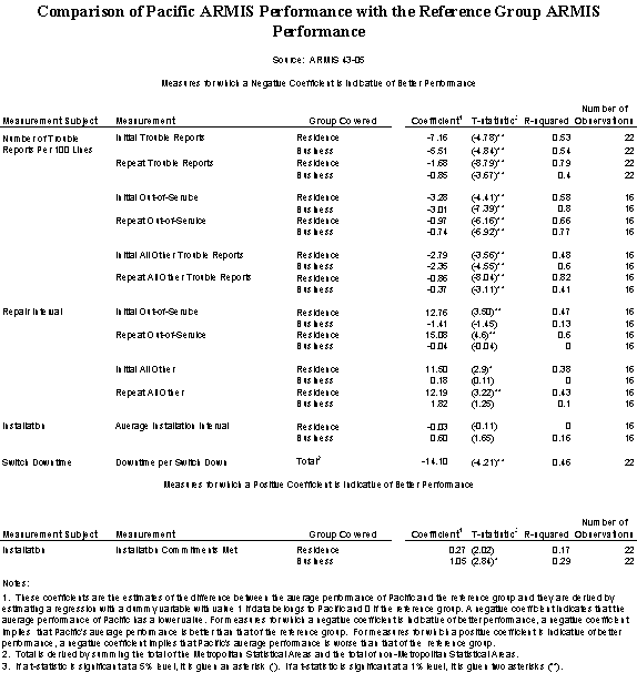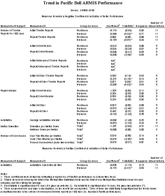 For the measures reported in ARMIS 43-05, we examined Pacific 68and Verizon's69 performance over the years, and compared it with each other and with the performance of the reference group.70 The major results of our statistical analysis are reported in the tables that follow.71 Although we present the analysis at this point as a reference matter, we will not discuss the results in this section. Subsequently, we describe each measure and we graph each carrier's performance in each of these measures.72 In these subsequent sections, we will comment on each utility's performance and indicate whether any improving or deteriorating trend is observed and discuss the results of our statistical analysis at that point. The reader unfamiliar with statistical analysis may jump over these tables to our subsequent discussion.