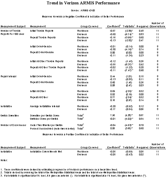We also conducted a statistical examination of how Verizon's service quality changed over time. We find that during the NRF period, Verizon's performance showed statistically significant improvement on the number of initial trouble reports (residential and business), the number of repeat trouble reports (residential and business), the number of initial out-of-service trouble reports (business), the number of initial all other trouble reports (business), the number of repeat all other trouble reports (business), the number of switches down, and the number of occurrences under two minutes. Verizon's performance has not shown any statistically significant change in the initial out of service trouble reports (residential), repeat out-of-service trouble reports (residential and business), initial all other trouble reports (residential), repeat all other trouble reports (residential), initial out-of-service repair interval (residential and business), repeat out-of-service repair interval (residential and business), initial all other repair interval (business), repeat all other repair interval (business), average installation interval (residential and business), and installation commitments met (residential and business). Verizon's performance has shown a worsening trend only in initial all other repair interval (residential), repeat all other repair interval (residential), switch downtime, and the percent of unscheduled occurrences.