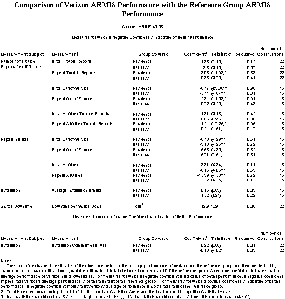 160 http://www.fcc.gov/wcb/mcot/SBC_AIT/service_quality/OP1.pdf. 161 http://www.fcc.gov/wcb/mcot/SBC_AIT/service_quality/RE3.pdf. 162 http://www.fcc.gov/wcb/mcot/SBC_AIT/service_quality/IN1.pdf. 163 http://www.fcc.gov/wcb/mcot/SBC_AIT/service_quality/IN2.pdf. 164 http://www.fcc.gov/wcb/mcot/SBC_AIT/service_quality/data.xls 165 For residential customers, the coefficient is -1.36 with t-statistic -3.12, significant at 1% level (R-square: 0.34, no. of observations: 21). For business customers, the coefficient is -0.46 with t-statistic -9.62, significant at 1% level (R-square: 0.83, no. of observations: 21). 166 For residential lines, the coefficient is -0.46 with t-statistic -9.62, significant at 1% level (R-square: 0.83, no. of observations: 21). For business customers, the coefficient is -1.50 with t-statistic -14.11, significant at 1% level (R-square: 0.91, no. of observations: 21). 167 For residential lines, the coefficient is -0.04 with t-statistic -3.64, significant at 1% level (R-square: 0.41, no. of observations: 21). For business lines, the coefficient is -0.02 with t-statistic -5.96, significant at 1% level (R-square: 0.65, no. of observations: 21). 168 The coefficient is zero with t-statistic 0.18, not significant at 1% or 5% level (R-square: 0.00, no. of observations: 12). 169 The coefficient is 0.003 with t-statistic 5.48, significant at 1% level (R-square: 0.75, no. of observations: 12). 170 20 RT 2529-31 (ALJ Thomas' ruling). 171 FCC 00-221, Condition 51. 172 We take official notice of this data pursuant to Rule 73. 173 http://www.fcc.gov/wcb/mcot/BA_GTE/service_quality/GTE_States/CU2.pdf. 174 http://www.fcc.gov/wcb/mcot/BA_GTE/service_quality/GTE_States/OP1.pdf. 175 http://www.fcc.gov/wcb/mcot/BA_GTE/service_quality/GTE_States/RE1.pdf. 176 http://www.fcc.gov/wcb/mcot/BA_GTE/service_quality/GTE_States/RE2.pdf. 177 http://www.fcc.gov/wcb/mcot/BA_GTE/service_quality/GTE_States/RE3.pdf. 178 For the residential lines, the coefficient is -0.30 with t-statistic -2.10, not significant at 1% or 5% level (R-square: 0.31, no. of observations: 12). For business lines, the coefficient is -0.21 with t-statistic -0.76, not significant at 1% or 5% level (R-square: 0.05, no. of observations: 12). 179 For the residential lines, the coefficient is 0.74 with t-statistic 1.24, not significant at 1% or 5% level (R-square: 0.13, no. of observations: 12). For business lines, the coefficient is -0.33 with t-statistic -0.35, not significant at 1% or 5% level (R-square: 0.01, no. of observations: 12). 180 For business lines, the coefficient is 0.25 with t-statistic 0.35, not significant at 1% or 5% level (R-square: 0.01, no. of observations: 12). 181 For the residential lines, the coefficient is 0.83 with t-statistic 1.24, not significant at 1% or 5% level (R-square: 0.13, no. of observations: 12). For business lines, the coefficient is 0.24 with t-statistic 1.73, not significant at 1% or 5% level (R-square: 0.23, no. of observations: 12). 182 For the residential lines, the coefficient is 0.09 with t-statistic 0.71, not significant at 1% or 5% level (R-square: 0.05, no. of observations: 12). For business lines, the coefficient is zero with t-statistic -0.06, not significant at 1% or 5% level (R-square: 0.00, no. of observations: 12). 183 For the residential lines, the coefficient is -0.005 with t-statistic -0.28, not significant at 1% or 5% level (R-square: 0.00, no. of observations: 12). For business lines, the coefficient is -0.004 with t-statistic -0.74, not significant at 1% or 5% level (R-square: 0.05, no. of observations: 12). 184 For the residential lines, the coefficient is 0.10 with t-statistic 0.57, not significant at 1% or 5% level (R-square: 0.03, no. of observations: 12). For business lines, the coefficient is 0.14 with t-statistic 0.63, not significant at 1% or 5% level (R-square: 0.36, no. of observations: 12). 185 For the business lines, the coefficient is approximately zero with t-statistic 1.19, not significant at 1% or 5% level (R-square: 0.36, no. of observations: 12). 186 For the residential lines, the coefficient is -0.001 with t-statistic -2.39, significant at 5% level (R-square: 0.36, no. of observations: 12). 187 For the residential lines, the coefficient is -1.71 with t-statistic -2.99, significant 5% level (R-square: 0.47, no. of observations: 12).