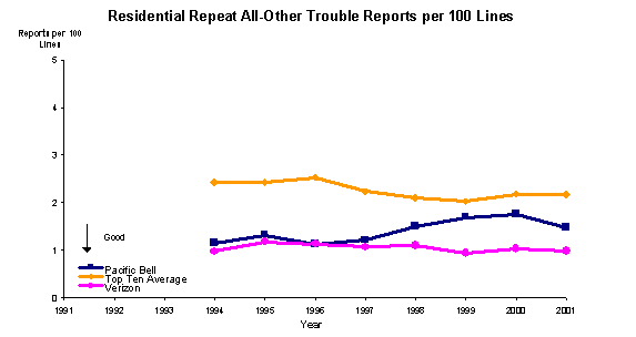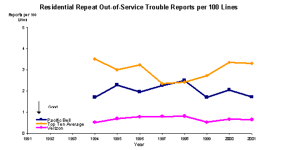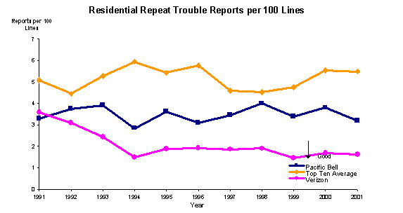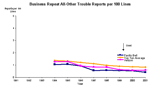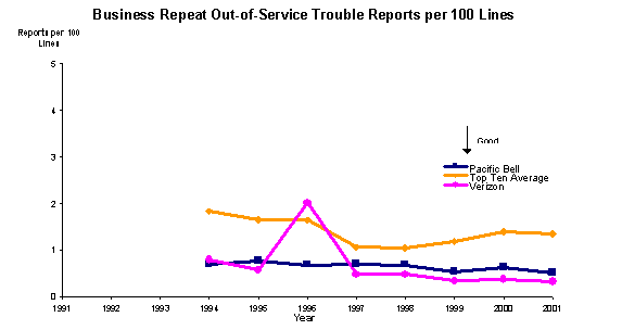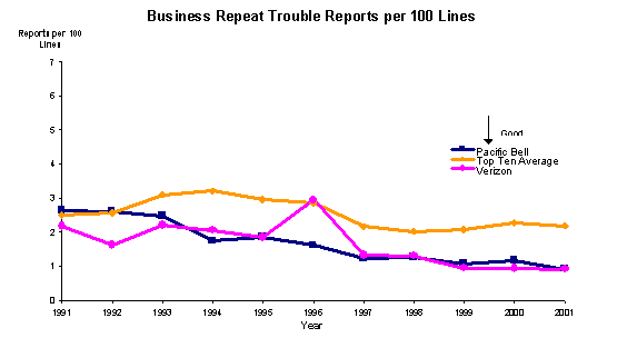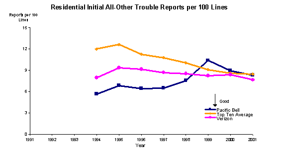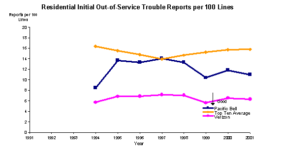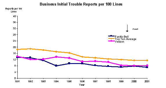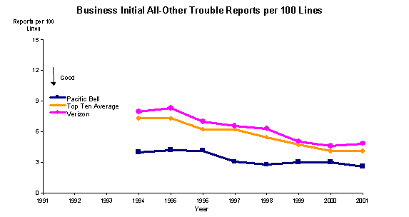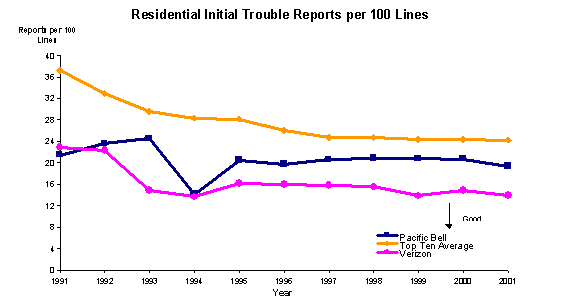 In summary, both Pacific and Verizon show good performance on this measure of service quality, initial trouble reports per 100 access lines for both residential and business customers. Verizon exhibits a better record than Pacific.