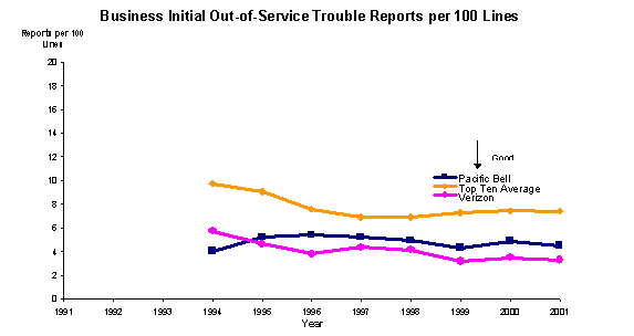 The initial out-of-service trouble reports refer to the troubles that cause the customer to be totally without telephone service. A visual inspection of the graphs below shows that Pacific's residential performance improved since 1997 and its business performance does not exhibit an upward or downward trend, and both appear better than the reference group. Our statistical analysis confirms that both these impressions are accurate. Pacific's performance does not exhibit a statistically significant upward or downward trend.84 Pacific's average performance has been significantly better than the average of the reference group.85