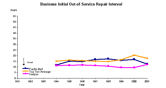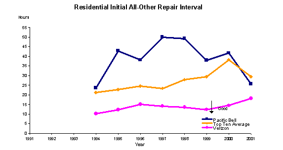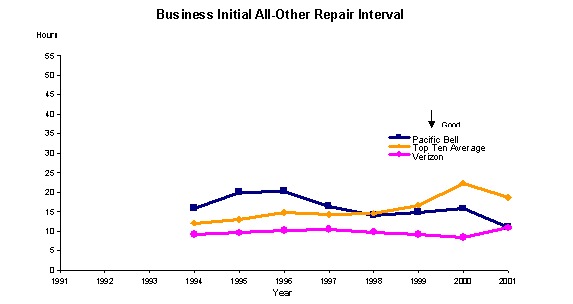 On this measure, Pacific's performance data appears to trend upward and double between 1994 and 1997, then trend downward between 1997 and 2001. As a visual review of the graph below illustrates, Pacific has performed worse than the reference group except in 2001. Again, in contrast with residential, Pacific's performance for business lines appears more stable and exhibits an improving trend. In fitting a straight line, the statistical analysis shows that Pacific does not exhibit an upward or downward trend for residential lines and some improvement is observed for business lines.123 Pacific's average performance for residential initial all other repair interval was statistically worse than the reference group. However, for business service, Pacific's performance was not statistically different than the reference group.124