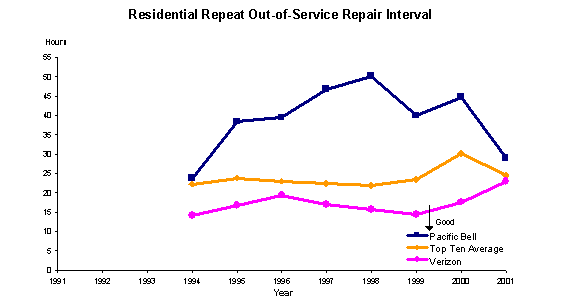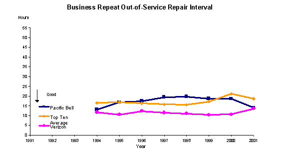 Pacific showed a high level of repeat problems shortly after making an initial repair. In 2000, at least 2.73% of residential repeat out-of-service repairs occurred within 24 hours of a previous repair; the number in 2001 was 2.38%. In 2001, the number of repeat problems within one week of a previous repair was 6.76%, 8.84% within two weeks, and 10.10% within three weeks.130 It may be that these figures represented different problems for the same customers. Whatever the problem is, however, these high numbers certainly affected customers. The disruption caused by a repair is probably one of the more serious events that can occur in a carrier's relationship with its customers. A second repair within such a short time is an even more serious disruption.