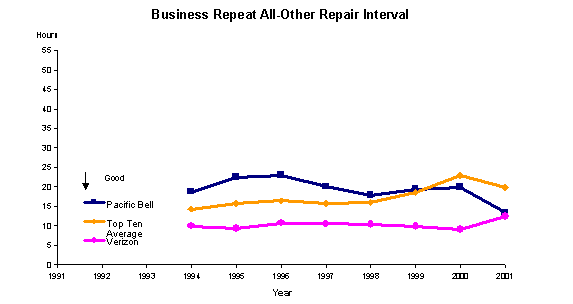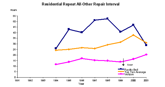 Visual inspection of the graphs below indicates that Pacific's residential repeat all other repair interval fluctuate over the NRF period. All other repair interval nearly doubled from 1994 to 1998, then declined from 1998 to 2001. In fitting a straight line to such a curvilinear trend, the statistical analysis indicates that Pacific's performance did not demonstrate any upward or downward trend for business and residential lines.128 Pacific's average performance is significantly worse than the reference group for the residential lines and the difference is not significant for business lines.129