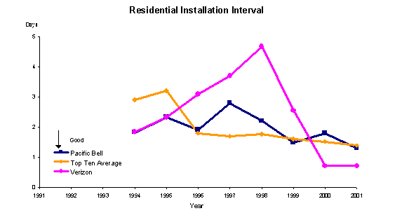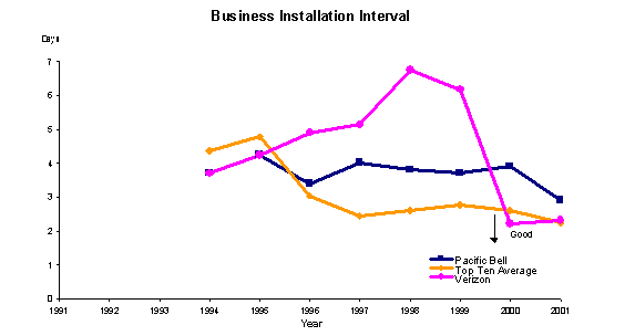 According to the data in the following graphs, Pacific's ARMIS performance on installation intervals (residential and business) was generally consistent over the 1994-2001 period. Pacific's data were slightly worse than Verizon's in 2000-01. As the graphs reveal, Pacific's installation intervals were generally better than Verizon's during the NRF period, with business installation intervals remaining stable in the 3-4 day range during the entire period 1994-2001. Residence intervals were not as steady, with small spikes in 1995 and 1997, but the overall numbers were generally lower than Verizon's except in 1994-95 and 2000-01. Concerning the reference group, it is difficult to draw any conclusions based on visual inspection. In some years, Pacific's performance exceeded that of the reference group, and in some years it did not.