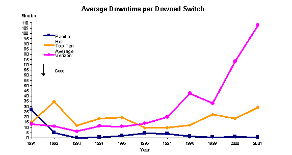 Verizon's downtime per switch exhibited an upward trend.143 Its average performance is significantly worse than Pacific.144 Verizon's average performance is also worse than the reference group, but the difference is not statistically significant.145
